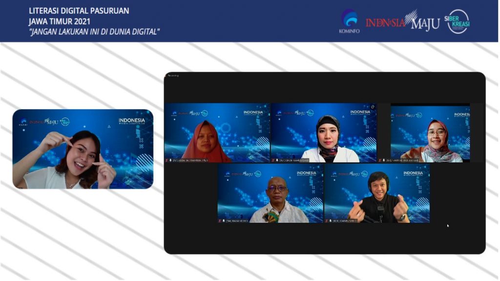 Pada acara kali ini, tema yang diangkat adalah Masih Adakah Privasi Di Dunia Serba Digital dan masing-masing narasumber berbicara  dari sudut pandang empat pilar utama Literasi Digital. Dengan jumlah 273 peserta, dapat dilihat antusiasme dari setiap peserta yang hadir pada acara hari ini, karena peserta seminar dan diskusi secara online yang hadir mempunyai kesempatan untuk bertanya kepada narasumber. Salah satu pertanyaan yang ditujukan kepada narasumber  Mira N Sahid  adalah Mengenai kebebasan berpendapat dan berekspresi di dunia digital, apakah kita diberbolehkan untuk curhat di dalam media sosial? Karena terkadang kita juga butuh ruang untuk menceritakan sesuatu, apakah salah atau benar? Jika boleh, batasan – batasan seperti apa untuk curhat dimedia sosial yang aman? Apakah etika yang dianut media selama ini masih relevan? Dan pada saat itu Mira N Sahid. langsung memberikan jawaban semua dikembalikan pada diri masing-masing, perlukah kita membagikan cerita pribadi kita dalam media sosial, apakah ada manfaatnya. Jangan sampai menjadi boomerang bagi diri sendiri pada persoalan di masa yang akan datang. Dan kemas dengan lebih baik jangan secara tulisan gamblang karena itu akan memberikan efek tertentu kepada curhatan kita yang tadinya niatnya hanya curhat jadi terkesan kita sembarangan menyebarkan kehidupan pribadi kita di ruang public. Kalau dalam keadaan emosi, sabar dulu, baca dulu sebelum posting. Yuk pahami etika didunia digital, kemas dengan hati yang menyenangkan supaya memberikan postingan yang positif dan bermanfaat. Untuk mengapresiasi para peserta yang bertanya mendapatkan doorprize sebagai bentuk apresiasi.  Dan juga seluruh peserta webinar yang hadir mendapatkan e-certificate.  Dengan berakhirnya acara kegiatan webinar hari ini, moderator, para narasumber, praktisi dan juga seluruh peserta yang hadir diminta untuk berfoto bersama melalui platform zoom sebagai wujud apresiasi terhadap seluruh narasumber dan juga peserta yang mengikuti kegiatan webinar ini.