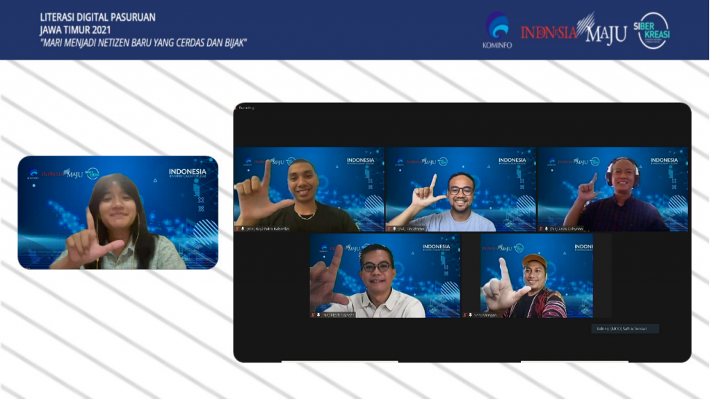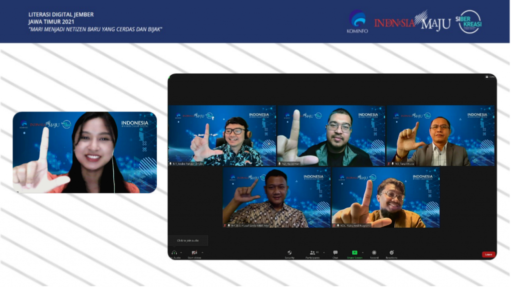 Penyelenggaraan Kegiatan Literasi Digital di Jawa Timur I kali ini diselenggarakan di kabupaten/kota Sidoarjo. Acara dimulai pukul 09.30 WIB secara virtual menggunakan platform Zoom. Acara dipimpin oleh Moderator, Muhamad Ridho, dengan menghadirkan 4 narasumber yaitu Ir. Andre Parvian Aristio, S.Kom., M.Sc., Chusnur Ismiati, S.H, M.M, Rachel Octavia, Andy Ardian, SP dan Erbe Sentanu (KOL).  Tercatat jumlah peserta yang mengikuti acara ini sejumlah 351.