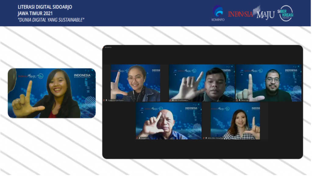Penyelenggaraan Kegiatan Literasi Digital di Jawa Timur I kali ini diselenggarakan di kabupaten/kota Sidoarjo. Acara dimulai pukul 09.30 WIB secara virtual menggunakan platform Zoom. Acara dipimpin oleh Moderator, Muhamad Ridho, dengan menghadirkan 4 narasumber yaitu Ir. Andre Parvian Aristio, S.Kom., M.Sc., Chusnur Ismiati, S.H, M.M, Rachel Octavia, Andy Ardian, SP dan Erbe Sentanu (KOL).  Tercatat jumlah peserta yang mengikuti acara ini sejumlah 351.