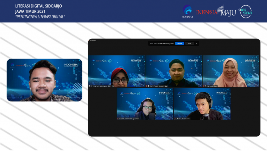 Penyelenggaraan Kegiatan Literasi Digital di Jawa Timur I kali ini diselenggarakan di kabupaten/kota Sidoarjo. Acara dimulai pukul 09.30 WIB secara virtual menggunakan platform Zoom. Acara dipimpin oleh Moderator, Muhamad Ridho, dengan menghadirkan 4 narasumber yaitu Ir. Andre Parvian Aristio, S.Kom., M.Sc., Chusnur Ismiati, S.H, M.M, Rachel Octavia, Andy Ardian, SP dan Erbe Sentanu (KOL).  Tercatat jumlah peserta yang mengikuti acara ini sejumlah 351.