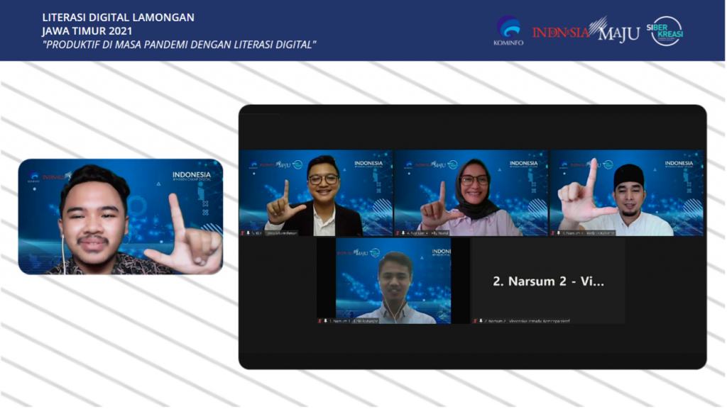 Penyelenggaraan Kegiatan Literasi Digital di Jawa Timur I kali ini diselenggarakan di kabupaten/kota Sidoarjo. Acara dimulai pukul 09.30 WIB secara virtual menggunakan platform Zoom. Acara dipimpin oleh Moderator, Muhamad Ridho, dengan menghadirkan 4 narasumber yaitu Ir. Andre Parvian Aristio, S.Kom., M.Sc., Chusnur Ismiati, S.H, M.M, Rachel Octavia, Andy Ardian, SP dan Erbe Sentanu (KOL).  Tercatat jumlah peserta yang mengikuti acara ini sejumlah 351.
