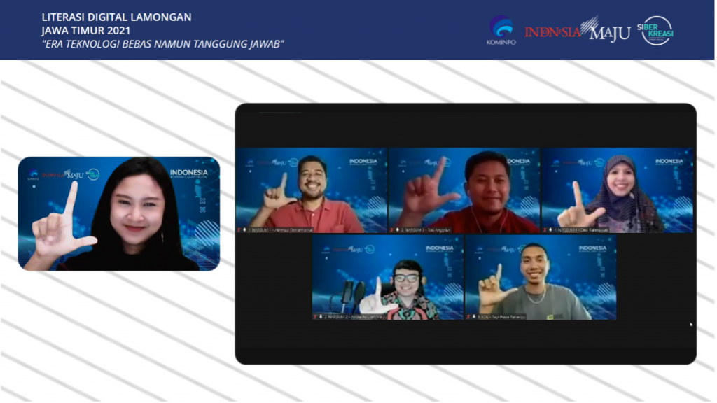Penyelenggaraan Kegiatan Literasi Digital di Jawa Timur I kali ini diselenggarakan di kabupaten/kota Sidoarjo. Acara dimulai pukul 09.30 WIB secara virtual menggunakan platform Zoom. Acara dipimpin oleh Moderator, Muhamad Ridho, dengan menghadirkan 4 narasumber yaitu Ir. Andre Parvian Aristio, S.Kom., M.Sc., Chusnur Ismiati, S.H, M.M, Rachel Octavia, Andy Ardian, SP dan Erbe Sentanu (KOL).  Tercatat jumlah peserta yang mengikuti acara ini sejumlah 351.