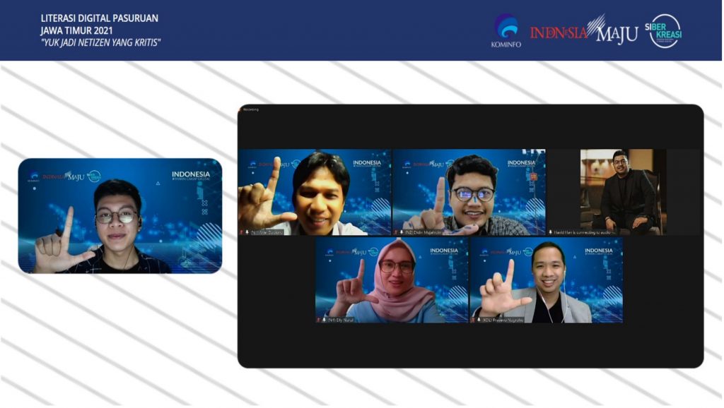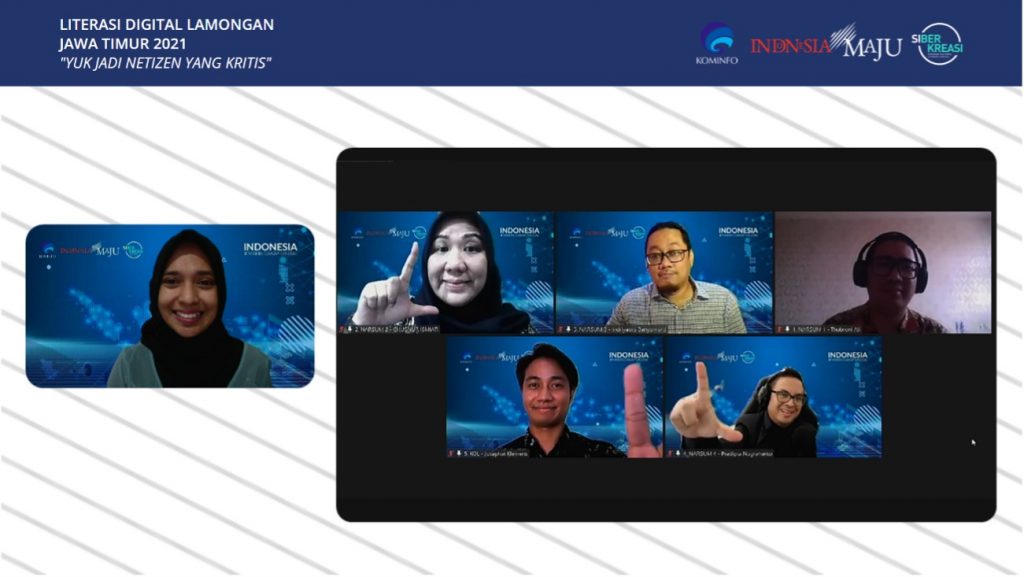 Penyelenggaraan Kegiatan Literasi Digital di Jawa Timur I kali ini diselenggarakan di kabupaten/kota Sidoarjo. Acara dimulai pukul 09.30 WIB secara virtual menggunakan platform Zoom. Acara dipimpin oleh Moderator, Muhamad Ridho, dengan menghadirkan 4 narasumber yaitu Ir. Andre Parvian Aristio, S.Kom., M.Sc., Chusnur Ismiati, S.H, M.M, Rachel Octavia, Andy Ardian, SP dan Erbe Sentanu (KOL).  Tercatat jumlah peserta yang mengikuti acara ini sejumlah 351.