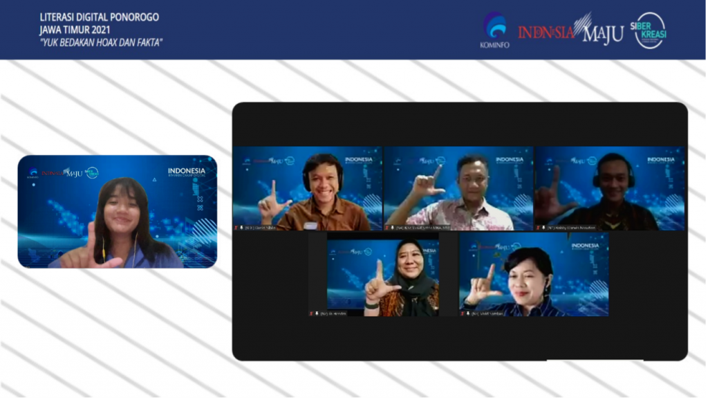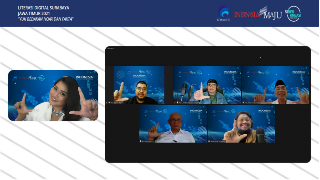 Penyelenggaraan Kegiatan Literasi Digital di Jawa Timur I kali ini diselenggarakan di kota Surabaya. Acara dimulai pukul 08.30 WIB secara virtual menggunakan platform Zoom. Acara dipimpin oleh Moderator, Salma Nafi’aturrofiah, dengan menghadirkan 4 narasumber yaitu Amherstia Pasca Rina, M. Sajoang, Maria Advianti, Prof. Zainal Arifin Hasibuan, Ph.D  dan Danin Sibilo.  Tercatat jumlah peserta yang mengikuti acara ini sejumlah 170.