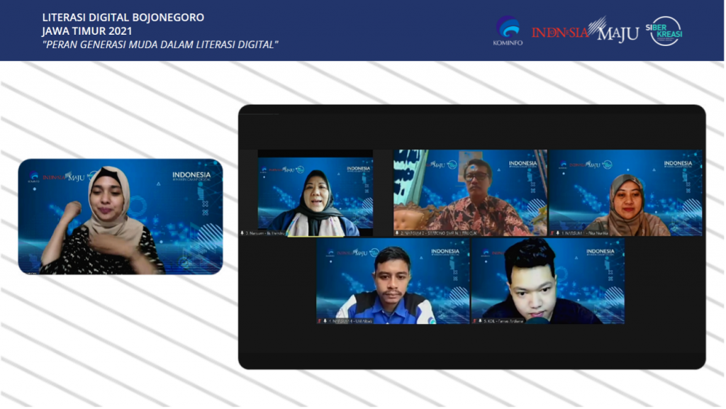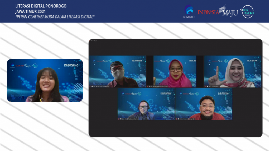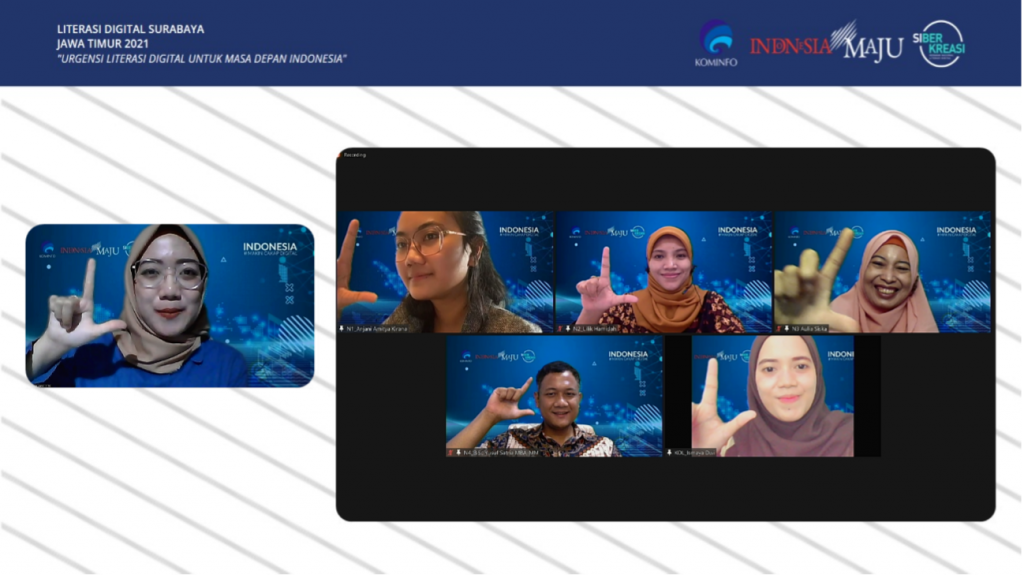 Penyelenggaraan Kegiatan Literasi Digital di Jawa Timur I kali ini diselenggarakan di kota Surabaya. Acara dimulai pukul 08.30 WIB secara virtual menggunakan platform Zoom. Acara dipimpin oleh Moderator, Salma Nafi’aturrofiah, dengan menghadirkan 4 narasumber yaitu Amherstia Pasca Rina, M. Sajoang, Maria Advianti, Prof. Zainal Arifin Hasibuan, Ph.D  dan Danin Sibilo.  Tercatat jumlah peserta yang mengikuti acara ini sejumlah 170.