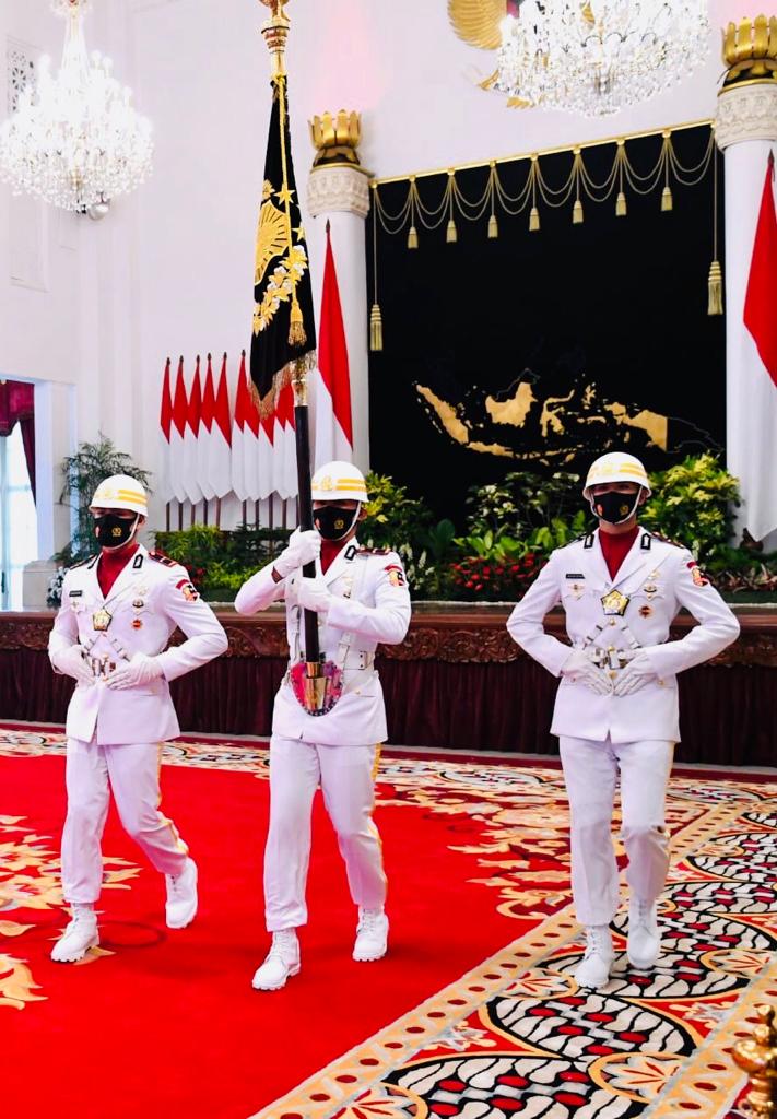 Presiden Joko Widodo menganugerahkan Tanda Kehormatan Bintang Bhayangkara Nararya kepada empat orang perwakilan penerima tanda kehormatan dalam Peringatan ke-74 Hari Bhayangkara yang digelar di Istana Negara, pada Rabu, 1 Juli 2020.